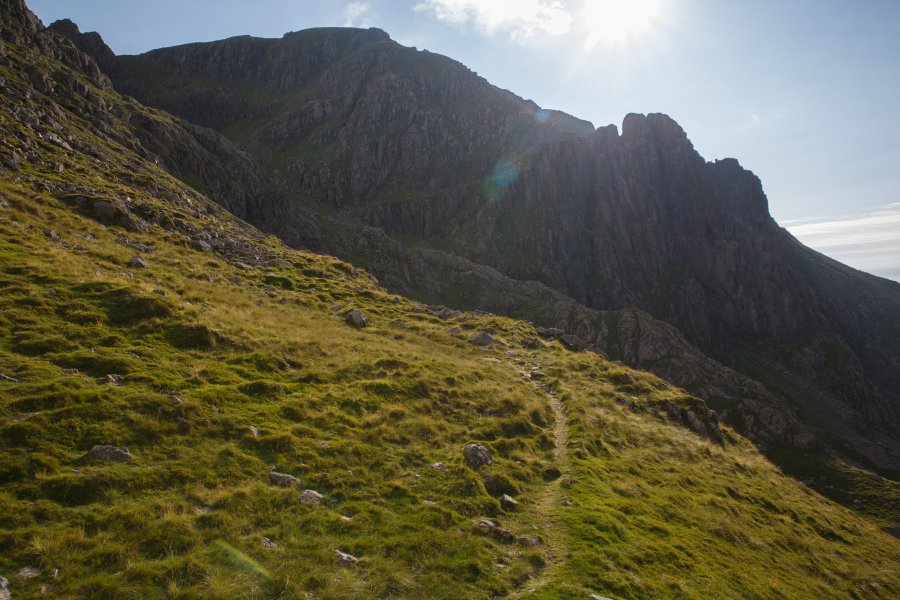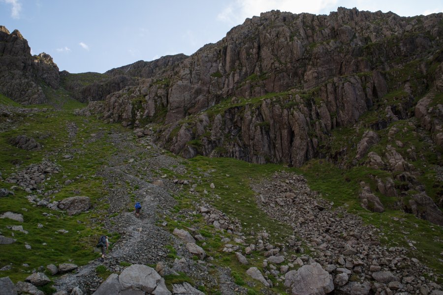 the direct route to the summit would be straight up the rock face. we fancied the longer and more adventurous high level route which you drop down onto by the right of the rock face. if i recall correctly i think there was a cairn showing it's start point. you have to climb down to the path by about 20 ft.