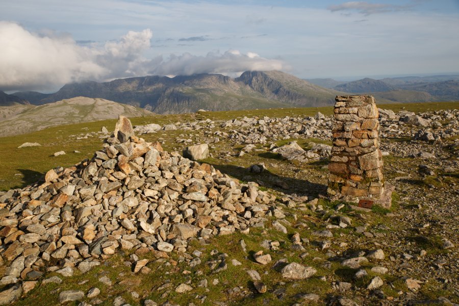 pillar summit with the scafell range in the distance. scafell pike with cloud on its top.. shocking!!
