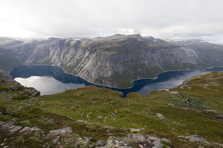 trolltunga is over there. over that bridge and towards the back right. a great landscape of solid rock, which is completely unlike the mountainous parts of england when it is a lot looser.