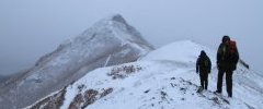 10.12.11 Scafell Pike Our little expedition was increased by 3 last night after our walk above Newlands (see here) with the arrival of Andrew, Ben and Geordie to our Lakeland retreat. It was good to see Ben again as I hadn't seen him since the Everest Trek last year. Today's route was a bit of a classic! A day of unsettled weather is once of the better times to visit Scafell Pike.. Thus eliminating the crowds. Although we got a little more snow than expected. Our ascent route was up Styhead Gill and along the Corridor Rout. I wanted to mix things up a little from Seathwaite Farm as I usually go up Grains Gill. The journey towards Styhead Tarn was a real ankle twister. Boulder strewn and icy with plenty of boggy patches, it required all of our concentration. Reaching the snowscape views across to Great End, Broad Crag and Lingmell Fell, it was very difficult to see the ascent line through all the white stuff. The gang were all new to the Corridor Route and a little unsure of where I was leading them. Once we found the track below Great End, the route ahead became clearer. There was a few moments of uncertainty due to the track being buried and at one point we found ourselves briefly in a precarious position.