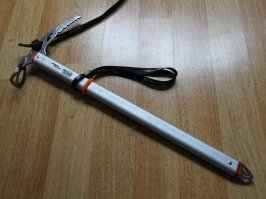 Petzl Snowalker for glaciel touring and snow slopes. This stainless steel axe is very lightweight and comes in three lengths which helps us lanky types. The rando leash that you see in the middle of the pole came with it although I dont think it is long enough so I bought another from DMM which I have attached to the cut out profile head. |